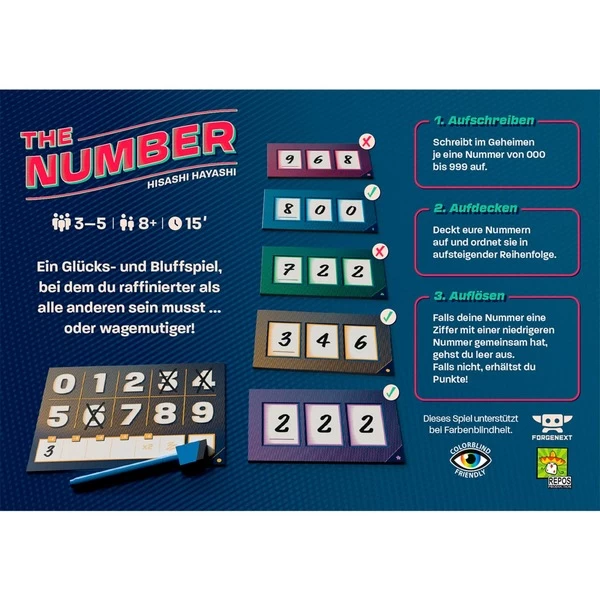 Bluffen und etwas Glück haben: Das ist The Number, ein Spiel mit Zahlen, bei dem Raffinesse und etwas Wagemut gefragt sind. In jedem Zug schreiben die Spieler im Geheimen je eine Nummer von 000 bis 999 auf ihre Nummerntafeln, bevor sie diese gleichzeitig aufdecken. Eine höhere Nummer bringt mehr Punkte, ist aber auch riskanter: Denn falls eine Nummer eine Ziffer mit einer niedrigeren Nummer gemeinsam hat, fliegt die höhere raus. Im Laufe einer Runde gibt es immer weniger Auswahlmöglichkeiten, wodurch jede Entscheidung strategischer wird. Nach zwei Runden gewinnt, wer das höchste Endergebnis hat.Art.-Nr.: 1902436
