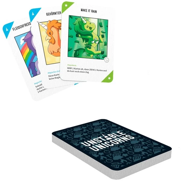 | Inhalt/Ausstattung | 114 schwarze Karten, 13 Baby-Einhorn-Karten, 8 Übersichtskarten | ||