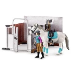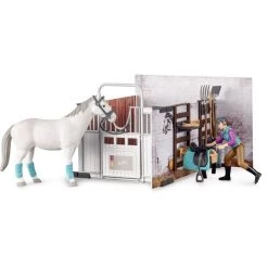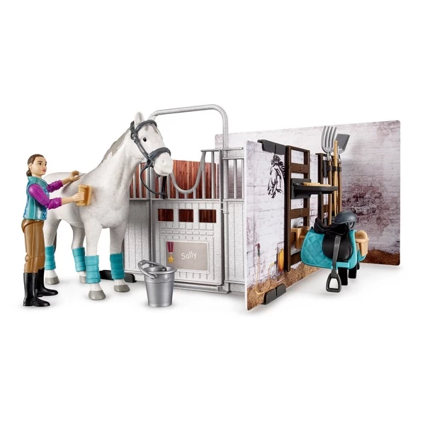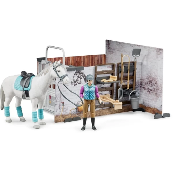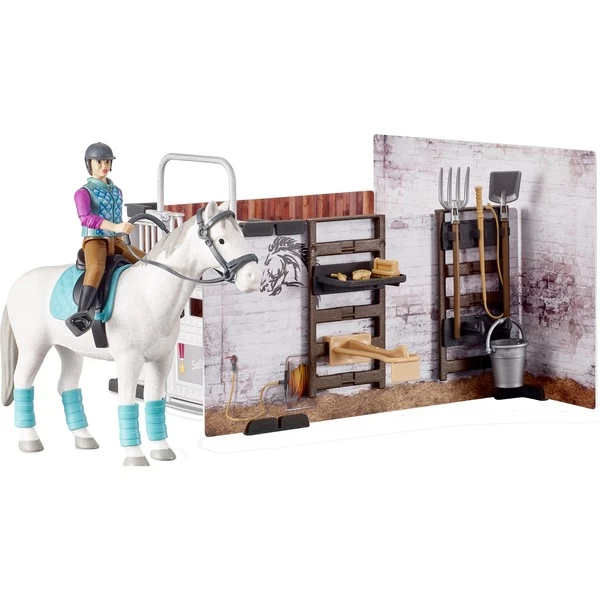 | Inhalt/Ausstattung | Pferdestall: Stallausrüstung bestehend aus Schaufel, Mistgabel, Eimer und Putzzeug, Reitausrüstung bestehend aus Sattel, Zaumzeug , 4 Gamaschen, schwenkbares Tor für Pferdebox, Wandregal mit Ablagen und Halterungen, beidseitig bedruckte Hintergrundelemente mit Stellfüßen, Reiterin mit Helm und Gerte, Pferd | ||