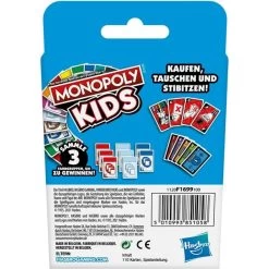 Hier kommt Monopoly Kids – ein spannendes und schnell zu spielendes Monopoly Kartenspiel. In diesem Spiel geht es um Zufall, Glück und Strategie, wenn die Spieler in Blindauktionen um die Wette bieten, mit Geldkarten bezahlen, Grundstücke mit Hilfe von Aktionskarten stibitzen und sich dann dank eines Jokers das Blatt wendet. Es geht reihum und die Spieler erhalten abwechselnd die Möglichkeit, eine Auktion durchzuführen. Jeder Spieler kann wählen, wieviel Geld er bereit ist zu setzen. Dann rufen alle Spieler zugleich „1, 2, 3 und Bieten!“ und legen gleichzeitig ihre Geldkarten mit den gewählten Beträgen auf den Tisch. Der Höchstbietende erhält das Grundstück. Wer als Erster 3 Grundstückssets gesammelt hat, gewinnt das Spiel. Monopoly Kids ist eine hervorragende Wahl für Familienspieleabende, als Mitbringsel zu Partys oder Aktivität zu Hause für Kinder ab 7 Jahren. Art.-Nr.: 1771691
