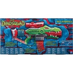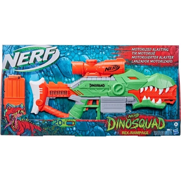 Als Mitglied der Elitetruppe DinoSquad verbünden sich Nerf Fans mit legendären Sauriern. Hier kann die außergewöhnliche Kraft der großartigsten Dinosaurier entfesselt werden, um sich in actionreiche Abenteuer zu stürzen. Mit dem Nerf DinoSquad Rex-Rampage Blaster kann das Battle mit der Power eines T-Rex starten! Er präsentiert saurierstarke Details und fängt den Look eines Tyrannosaurus Rex perfekt ein. Einfach den Motor hochpowern und den Abzug drücken, um die Darts schnell abzufeuern. Er kommt mit einem 10-Dart Clip-Magazin, sodass 10 Darts in Folge dem Ziel entgegengeschickt werden können. Der Blaster verfügt über eine integrierte Dart-Aufbewahrung für 10 Darts, um sie für schnelles Nachladen in Reichweite zu haben. Ebenfalls enthalten ist ein fest angebrachtes und nicht abnehmbares Zielfernrohr, um den Schuss zielgenau auszurichten. Er kommt mit 20 Nerf Elite Darts, die auf Leistung und Qualität getestet wurden.Art.-Nr.: 1716864