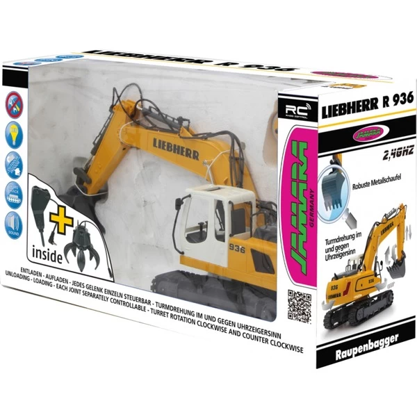 Der Liebherr Bagger R 936 von Jamara ergänzt die große 1:20 Baumaschinen-Serie um ein weiteres Highlight. Offiziell lizenziert mit echten Funktionalitäten, die man vom großen Original abgeschaut hat. So lassen sich z.B. alle Gelenke des Raupenbaggers mit der 2,4 GHz Funkfernsteuerung einzeln ansteuern ebenso wie die 660° Turmdrehung, im- und gegen den Uhrzeigersinn. Die robuste Metallschaufel zum Be- und Entladen ist serienmäßig enthalten. Als weitere Anbaugeräte sind jetzt der Schalengreifer mit Ball und der Abbruchhammer serienmäßig im Lieferumfang enthalten. Die Anbaugeräte können problemlos ohne Werkzeug am Greifarm montiert und demontiert werden. Die Sound-Palette reicht vom realistischen Motorsound (abschaltbar) über die Hupe bis hin zum Rückfahrwarnsound. Der Liebherr R936 verfügt über eine Autoabschaltfunktion. Alle diese Kriterien machen den Liebherr-Bagger zum unverzichtbaren Helfer auf jeder Wohnzimmer- und Gartenbaustelle.Art.-Nr.: 1391551