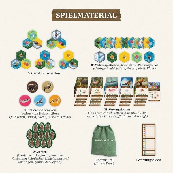 | Inhalt/Ausstattung | 100 bedruckte Tierscheiben aus Holz, 85 Wildnisplättchen, 25 Zapfenmarker, 21 Wertungskarten, 5 Start-Landschaften, 1 Wertungsblock, 1 Stoffbeutel, 1 Spielanleitung | ||