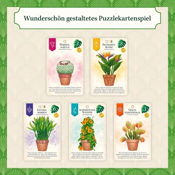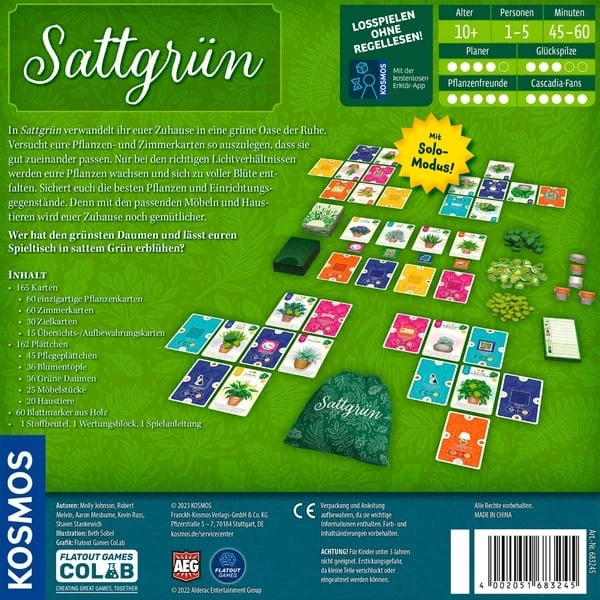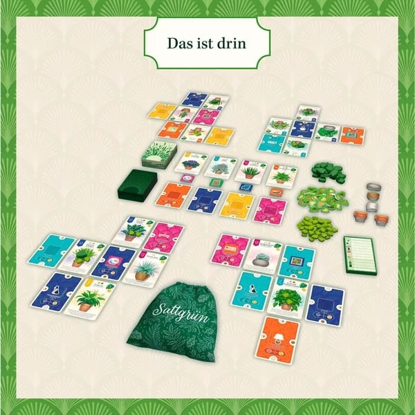 Ein Spiel für Hobbygärtner oder andere Menschen mit grünem Daumen: Wessen Zuhause ist besonders grün und gemütlich? Zum Beginn von „Sattgrün“ wird eine Kombination aus einer Zimmer-, einer Pflanzenkarte und einem Einrichtungsgegenstand gewählt. Unter Beachtung der Regeln und verschiedener herausfordernder Varianten soll das Grün nun vermehrt werden. Das Spiel enthält auch eine Solo-Variante. Art.-Nr.: 1903590