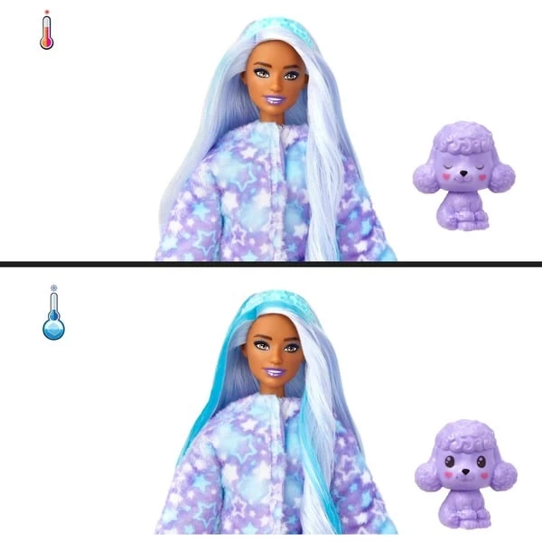 Bei den Puppen aus der Serie Barbie Cutie Reveal Cozy Cute ist schon das Auspacken ein besonderes Erlebnis. Unter dem Plüschkostüm verbirgt sich jeweils eine bewegliche Barbie-Puppe mit langen, bunten Haaren. Hinzu kommen 10 Überraschungen, wie zum Beispiel ein Stirnband, Kleidung oder ein passendes Mini-Haustier. Das Kostüm kann einfach gewendet werden und schon wird es eine kuschelige Fleece-Jacke – aus dem Kostüm-Kopf entsteht ein Bett für das Haustier. Kaltes Wasser löst einen Farbwechsel-Effekt auf den Haaren der Puppe und dem Haustier aus. Warmes Wasser macht diesen wieder rückgängig. Mit diesem Set kommt eine Puppe im süßen Plüschpudel-Kostüm mit dem Aufdruck „Star“.Art.-Nr.: 100024208