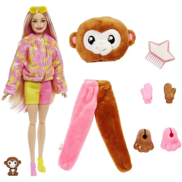 Bei den Barbie-Puppen aus der Barbie Cutie Reveal Dschungel-Reihe ist schon das Auspacken ein besonderes Erlebnis. Außerdem begeistert jede Puppe mit 10 Überraschungen. Wird das Plüschkostüm abgenommen, kommt eine bewegliche Barbie-Puppe mit langen, bunten Haaren zum Vorschein. Auf dem Gesicht jeder Barbie-Puppe befinden sich hübsche Details, die dem niedlichen Look das gewisse Etwas verleihen. Weitere Überraschungen umfassen tolle Accessoires und ein Mini-Haustier, das zum Kostüm der jeweiligen Puppe passt. Das Kostüm kann einfach umgedreht werden und schon wird aus dem Plüschoberteil eine Fleece-Jacke und aus dem Kostümkopf ein Bett für das Haustier. Eiskaltes Wasser löst einen Farbwechseleffekt auf der Puppe und dem Mini-Haustier aus. Mit warmem Wasser nehmen Puppe und Mini-Haustier wieder ihre ursprüngliche Farbe an. Art.-Nr.: 100024228