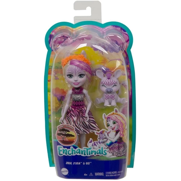 Die Enchantimals sind eine Gruppe liebevoller Charaktere, die mit ihren besten Tierfreunden auf ganz besondere Weise verbunden sind. Das Zebramädchen Zadie Zebra (15,2 cm) aus der Sonnensavanne-Kollektion wird von Ref begleitet – sie sind immer zusammen und sehen sich sogar ähnlich! Kinder werden die Zadie Zebra Puppe mit ihren gewellten Haaren und ihrem trendigen Stil lieben. Für modischen Spielspaß trägt sie einen abnehmbaren Rock, Stiefel und Kopfschmuck. Sie und Ref haben zueinander passende Details, die der Fantasie Flügel verleihen, wie hübsche Streifen und Schwänze. Die besondere Verbindung dieser besten Freunde lässt Kinderherzen höher schlagen!Art.-Nr.: 1713359