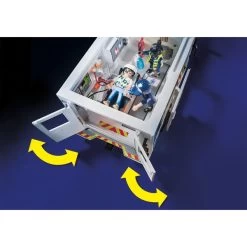 Das mutige PLAYMOBIL-Rettungsteam ist immer im Einsatz, um Menschen zu helfen. Sobald ein Notruf eingeht, schnappen sich die Sanitäter den Arztkoffer und springen in das Rettungs-Fahrzeug. Mit Blaulicht und Sirene beginnt die Fahrt. Vor Ort untersucht die Ärztin den verletzten Radfahrer und legt einen Kopfverband an, dann wird der Patient auf die Liege gehoben und zur Sicherheit festgeschnallt. Die Hecktüren des Rettungswagens werden geöffnet und die Liege vorsichtig hinein geschoben. Jetzt geht es zur weiteren Untersuchung ins Krankenhaus. Das Set enthält ein Rettungs-Fahrzeug, eine Ärztin und zwei Sanitäter, einen Mann, ein Fahrrad, eine Krankentransportliege, Arztkoffer, Diagnosetafel und viele weitere Extras für aufregende Rettungseinsätze. Über zwei Taster können verschiedene Lichteffekte ausgelöst werden. Die Dächer von Fahrerkabine und Behandlungswagen sind abnehmbar. Arztkoffer und Ausrüstung finden in der Schublade unterhalb der Fahrerkabine Platz.Art.-Nr.: 1802775