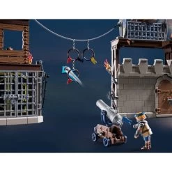 Mach Dich bereit für aufregende Ritterabenteuer mit diesem riesigen Set aus der Welt von PLAYMOBIL Novelmore! Die Konfrontation zwischen Novelmore und den Burnham Raiders startet in dieser Ritterarena – es geht darum, das sagenumwobene Wächter-Schwert zu erringen. Arwynn und Dash liefern sich ein spannendes Duell: Beide versuchen ihre Kanonenkugeln als Erster durch die Zielringe zu schießen und dadurch möglichst viele Punkte zu erzielen. Wer wird am Ende als Sieger hervorgehen? Die Turnierarena bietet mit verschiedenen Zielen, Falltüren und funktionsfähigen Kanonen viele Möglichkeiten für die Ritter, ihre Kampf- und Verteidigungskünste zu demonstrieren: Der Turm ist mit einem Durchbruch und einer Falltür ausgestattet, die durch das Treffen der Zielscheiben ausgelöst werden können. Im unteren Teil des Turms befindet sich ein Gefängnis mit zwei verschließbaren Toren. Über dem Wehrgang ist ein Käfig mit dem geheimnisvollen Wächter-Schwert. Zum Öffnen des Käfigs muss das Schild mit einer Kanonenkugel getroffen werden. Das Set kann an die große Burg von Novelmore (Set 70220, separat erhältlich) angebaut werden.Art.-Nr.: 1889044