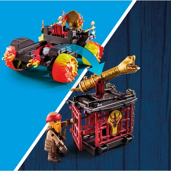 Vor diesem Kamfpwagen erzittern die Feinde: Mit seinen Flammenrädern ist er eine beeindruckende Erscheinung und noch dazu stark bewaffnet. Auf dem Dach des Käfigs befindet sich eine Kanone für Feuerpfeile und Verfolger schüttelt der Wagen durch die Abwurffunktion für Steine am Heck ab. Trifft der Wagen auf ein Hindernis wird der grimmige Krieger Sulphur per Schleudersitz in die Luft katapultiert!Art.-Nr.: 1889045