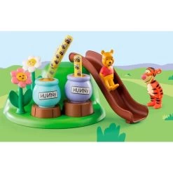 | Inhalt/Ausstattung | Figuren: Winnie Puuh und Tigger. Zubehör: Rutsche mit zwei Honigtöpfen, 2 Blumen, 2 Bienenstäbe. | ||