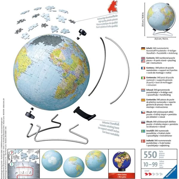 | Inhalt/Ausstattung | 540 nummerierte Kunststoff-Puzzleteile, Aufstellfuß, Drehfuß, 27 Teile Mini-Globus, Anleitung | ||