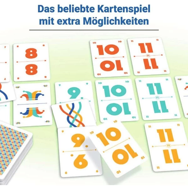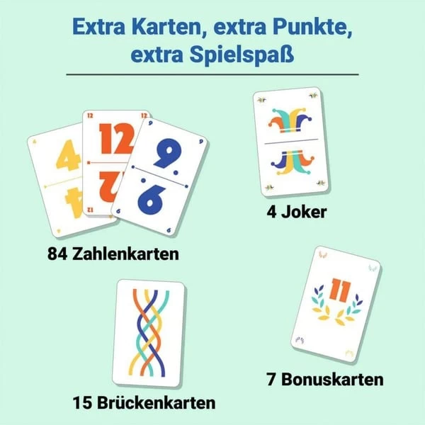 | Inhalt/Ausstattung | 110 Karten (84 Zahlenkarten, 15 Brückenkarten, 7 Bonuskarten, 4 Joker), Spielanleitung | ||