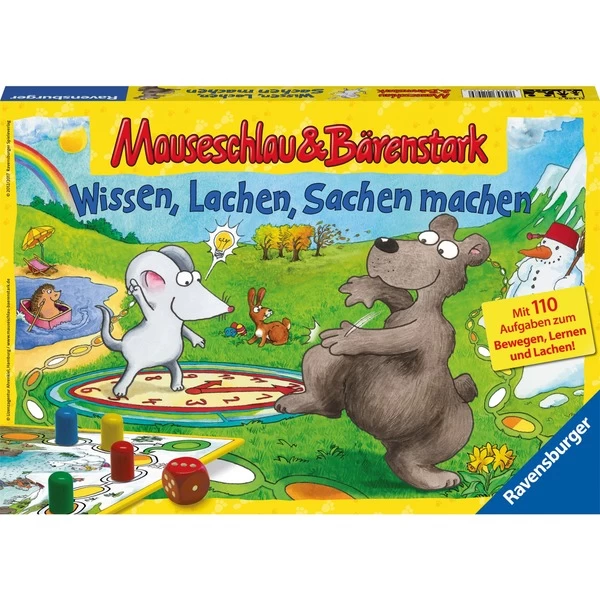 „Mauseschlau und Bärenstark stehen um sieben Uhr auf. Stelle die Uhr.“ So lautet eine Aufgabe der vielen mauseschlauen Wissenskarten. Dabei lernen die Kinder spielerisch die Uhr kennen. Andere Fragen helfen dabei, die Jahreszeiten zu verstehen oder mehr über bestimmte Tiere zu erfahren. Die bärenstarken Aktionskarten fordern die Spieler zu Aktionen wie dieser auf: „Flattere und gackere wie ein aufgescheuchtes Huhn.“ Wenn die Spieler die Fragen richtig beantworten und die Aktionen gut ausführen, gewinnen sie die entsprechenden Karten. Bei Mauseschlau & Bärenstark „Wissen, Lachen, Sachen machen“ ziehen die Spieler mit ihrer Spielfigur eine Runde um den Spielplan und entdecken dabei die unterschiedlichen Jahreszeiten. Sobald ein Spieler nach einer Runde sein Startfeld erreicht, endet die Spielrunde. Wer nun die meisten Wissens- und Aktionskarten sammeln konnte, gewinnt. Die Kombination aus Würfellaufspiel und Quizspiel sorgt für Abwechslung und durch die Aktionskarten kommt zusätzlich Bewegung und jede Menge Spaß ins Spiel.Art.-Nr.: 1329622