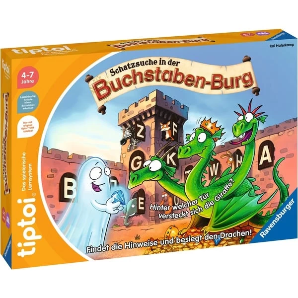 Im tiptoi-Spiel „Schatzsuche in der Buchstabenburg“ suchen die Kinder den Schatz des Drachen. Tiptoi nennt den Kindern Laute oder Tiere, die sie den passenden Bildern oder Buchstaben zuordnen müssen. Wurde der Schatz gefunden, wählt tiptoi eine von zehn Aufgaben des Drachen aus. Bei diesen Aufgaben geht es um Laute, Reime, Silben und Wörter. Zusätzlich gibt es eine Variante für Fortgeschrittene, bei der tiptoi Tiere ansagt, zu denen die Kinder die Buchstaben finden müssen. So lernen sie ganz spielerisch den Umgang mit Buchstaben und Wörtern.Art.-Nr.: 1876109