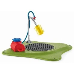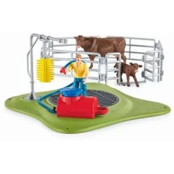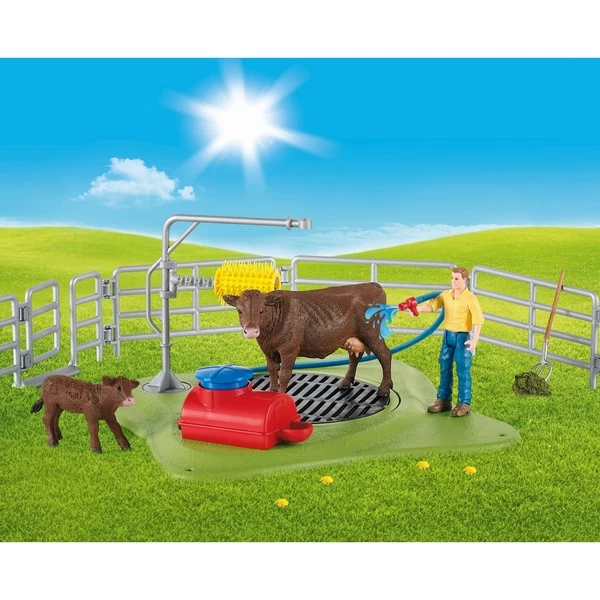 Heute ist Waschtag: Es herrscht Hochbetrieb in der neuen Kuh Waschstation von Schleich FARM WORLD! Die Kühe kommen von der Weide und müssen gewaschen werden bevor es in den Stall zurück geht. Besonders das kleine Kalb ist sehr gespannt. Heute ist es zum ersten Mal mit seiner Mutter in der Waschstation. FW Bauer Martin hat auf die Wasserpumpe gedrückt und schon kann es losgehen: Was für ein Spaß! Das kleine Kalb steht auf der Drehscheibe und kann so von allen Seiten geputzt werden. Nach der Dusche von FW Bauer Martin geht es noch schnell zur Massagebürste. Das macht Spaß!Art.-Nr.: 1721564