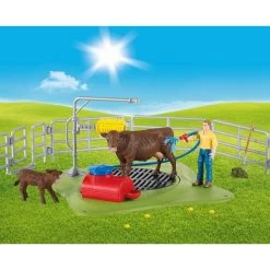 | Inhalt/Ausstattung | 1x Bauer, 1x Kuh, 1x Kälbchen, 1x Heugabel, 1x Heu, 5x Weidenzaun, 1x Tor, 1x Kuhbürste, 1x Halterung Kuhbürste, 1x Stange, 1x Bodenplatte mit Drehteller, 1x Schlauch, 1x Wasserpumpe mit Spritzfunktion | ||