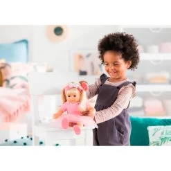 Diese etwa 36 Zentimeter große Weichkörperpuppe kann sitzen und ihren Daumen im Mund behalten. Sie kommt in einem süßen Outfit: Ein pinkes Kleid mit Schwanen-Print, eine bunte Schleife und bunter Kragen. Mit dabei hat sie eine Bürste für ihr langes, blondes Haar. Die Schlafaugen lassen die Puppe friedlich ihre Augen schließen, wenn sie hingelegt wird. Mit ihrem geringen Gewicht ist sie auch für kleine Kinder leicht zu tragen und daher gut zum Kuscheln und Umarmen geeignet. Wie alle Corolle-Puppen riecht sie angenehm zart nach Vanille.Art.-Nr.: 1743194
